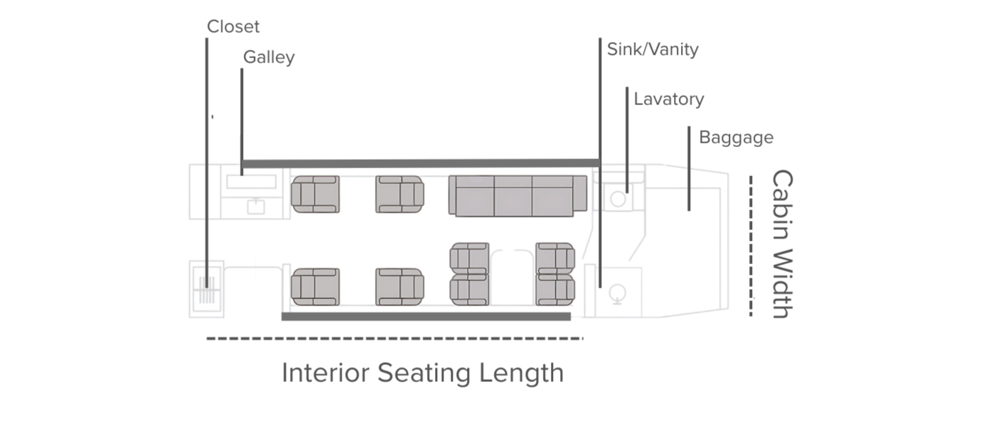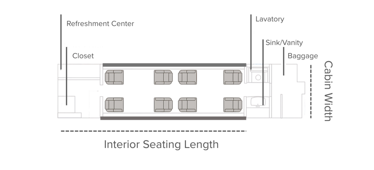 Midsize jets seat 6–9 for 4–5 hour coast-to-coast flights.